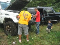 マルチリフレクターランプを 取り付けるためにグリルを 外す赤Tシャツのアホと 手伝ってくれた黄Tシャツの坊主 |