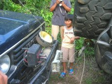 何ゆえに友人の車を 駆っていたかは別として・・ とりあえず救出開始。 巨体80、ソフトカーロープごとき ではピクリとも動かず・・・ |