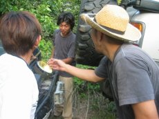 | なんとかガムテープで よこっち号を補修しようと 必死な麦わら会長。 ちなみにブツけられた よこっち号に同乗の 奥様は・・「残りの毛〜むしり 取ってまうど!ゴルァ〜!!」と ご立腹だったとか? |