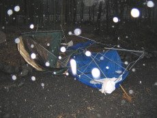 放置したタープを見に行くと、 ウチのスクリーンがっ!! 飛ばされた他所様の ホップアップの骨に 突き刺さってる〜(TT) ペグダウンしてたけど、 やはり自然には勝てない・・ |