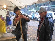 | 美味しそうな香りに誘われて 本部テントへ・・ 割った竹にパン生地を 巻いて焼く 棒巻きパンだ♪ |