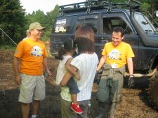 | 本部前、オーナーズグッズ 略してオナグッズ販売所・・ ナイスな手ぬぐいも。 横転車両モデルは 光栄な事に、わたくしだ。 一枚売れる事に、30ペソの マージンが印税として 自分に入る(嘘) |