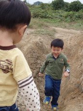 ヘビに睨まれたカエル状態で 固まる長男坊。 親に似て死んだフリがうまい。 5歳にして、世の中の 渡り方をマスターしたのか・・ 長いものには巻かれろタイプ。 まさに虚弱息子だ。 |