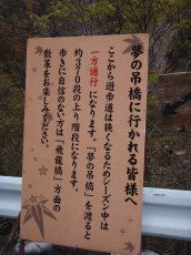 寸又峡温泉街から 1周約90分の道のりを楽しむ 散策路、それが寸又プロムナード。 途中、「夢の吊り橋」があり、 歩きに自信の無い方は 迂回して別ルートへと促す。 ・・・・けどね・・ |