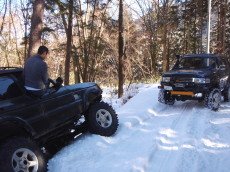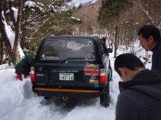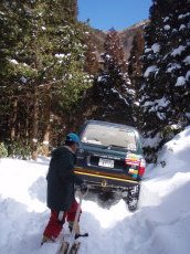 | ”トラブ竜”発生・・ 無謀にも、SUVと呼ばれる シャコタン一般車が 途中で道を塞いで立ち往生。 どうやら単独で雪山に 来たようだが・・レスキューして ご勇退願う。 |