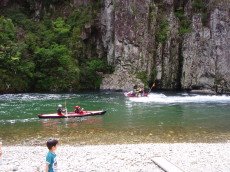 この中間地点で川は大きく カーブしており、ジェットスキーや カヌーなど、往来は激しい。 ジェット船とは別に、 和船による、のんびりと 川風景を堪能できるプランも。 大人だけなら和船だったな・・ |