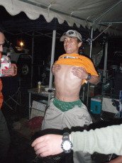 | 今年も総合司会を務める こーじ@夜見るとツルっパゲ?氏 カメラを向けると 話が長げ〜ので、 VTR回すキタマラ監督 ADウメちゃんに促され バッサリとカットで御願いします。 |