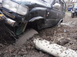 | んん? 夢では無さそうだぞ。 あ、そうね。 俗に言う【横転】ってヤツね。 気がつかなかったわ(笑) ヌタを避けようと、キャンバーにて。 |