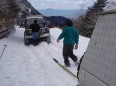 そんなこんなで、 当初予定の5台から 1台戦線離脱で計4台での スノーアタック。 あれ?5合目広場着。 予想を下回る積雪ですけど? やはり暖冬小雪は まんざらでもないのか・・ |