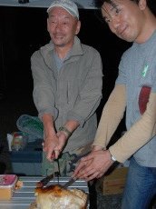 | マツ爺が 快調に若気の至り話に 花を咲かせる中、 運悪く(?)、たっくん現地入り。 死にかけたマツ爺の眼が キラリと光ったのを 見逃さなかった。 |