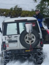 雪中初参加メンバーのひとり てっちゃん先生。 DIYで使うコンクリートブロックを 運ぶためだけに買った 懐かしいデリカトラックで参戦。 ピンツガウアー (オーストリアの軍用車)風。 |