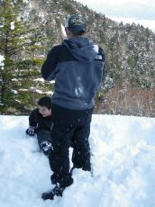 | イテっ! おい・・なんか飛んで・・ 冷てぇってばよ・・ 背中に雪が当たったぞ? コラっ! カメラはヨセ。 顔面は許可する。 |
