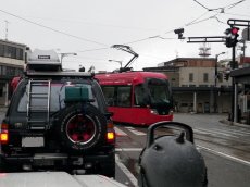 バーガー食べられず 傷心のキトゥ号を先頭に。 富山県内では路面電車を 運行する事業者が3社もある。 バスよりも環境にやさしいと 近年また復活の兆し。 多くは低床タイプの次世代型。 |