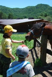 | 乗馬って言っても引き馬なのでね。 長男の乗る馬は 途中で立ち止まり、草食ってた 食いしん坊号(笑) 乗り手の性格は馬に伝わるらしい。 馬の知能はボキより高いのだ。 |