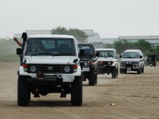 | 怪酔欲集団も続々と 登場の内灘砂漠。 先導はモチロン 今回の企画発案エ口魔人、 イケメソ地元民らいと号だ。 |