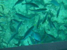 | 要所要所で船が停まると 熱帯魚ウジャウジャ寄って来る。 波が高くなければ サンゴ礁の先端までイケルが この日は大揺れ。 同乗した客の60代ババァが 「ギャぁ〜コワイー」とダミ声で のたまったので早めに 終了しちゃったぢゃん(゚Д゚#) |
